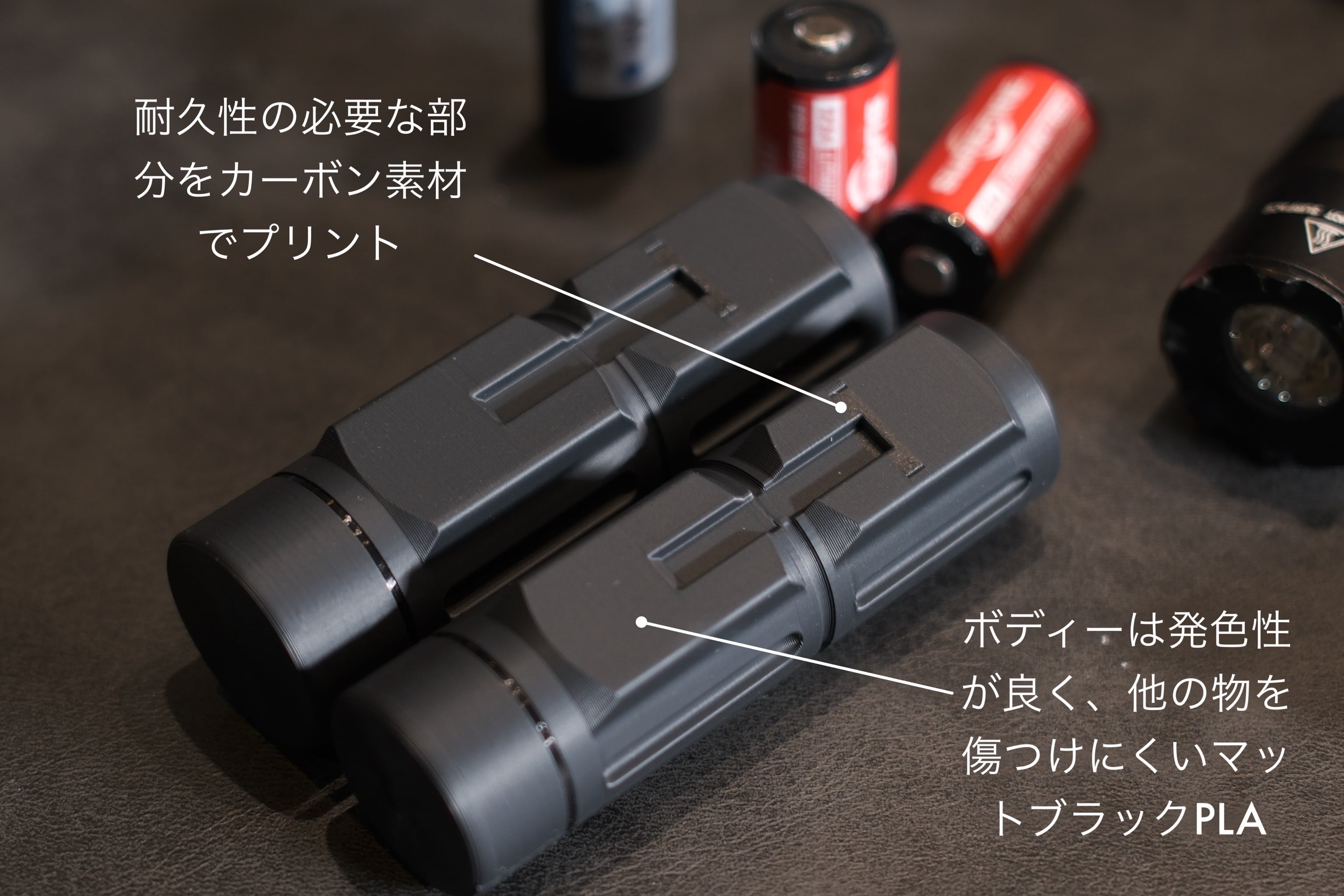 ボディ:ポリ乳酸樹脂(マットPLA)、カーボンフィラメント(PLA-CF)